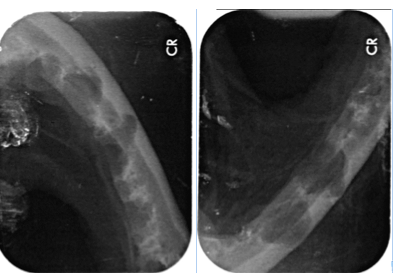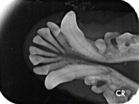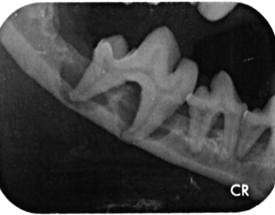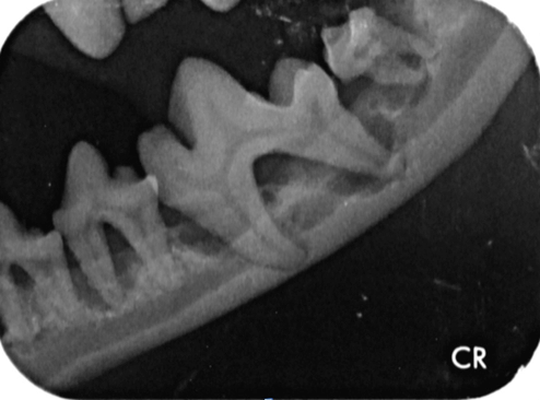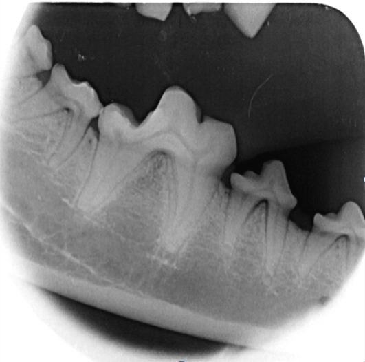 In Narkose sah man auf Leilas Röntgenbildern dann das gesamte Ausmaß ihrer Zahnerkrankung. Bis auf die Canini wiesen alle Zähne hochgradige Wurzelentzündungen mit Osteolysen des Kieferknochens auf. Deshalb konnte man auch schon von außen die Zahnhälse freiliegend sehen. Im Wurzelbereich waren die Veränderungen so schlimm, dass der Unterkiefer kurz vor einer Fraktur stand.