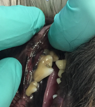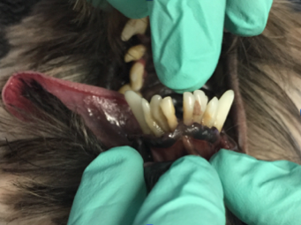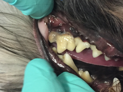 Solche Veränderungen treten oft bei einer hochgradigen Parodontitis auf. Eine Parodontitis ist die Entzündung des gesamten Zahnhalteapparates (also des Kieferknochens, des Zements, der Paradontalfasern und des Zahnfleischs) und wird durch die Bakterien, welche im Plaque enthalten sind, hervorgerufen. Diese zerstören die Anheftung der Gingiva am Zahn, und die Bakterien können bis zur Wurzel vordringen. Hier rufen sie Entzündungsreaktionen des Kieferknochens und der Gingiva hervor, wodurch beide sich zurückziehen und tiefe Paradontaltaschen entstehen lassen. Doch Leila hatte, wie auf den Bildern schön zu sehen ist, kaum Zahnstein oder Plaque.