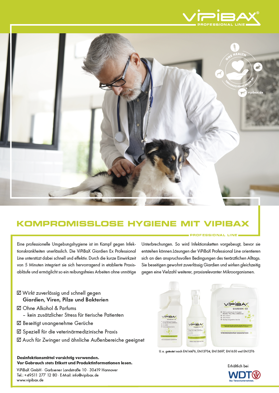 Giardiose verursachen können. Der Befall mit Giardien stellt gerade für Welpen und alte Hunde ein großes Risiko dar, hinzu kommt, dass die Parasiten auch vom Hund auf den Menschen übertragen werden können. Für die Tierarztpraxen hat das Unternehmen in der Professional Line ein Wischkonzentrat und ein Hygienespray entwickelt, doch wünscht sich der Firmengründer, dass die Tierärzt:innen einen Vorrat seiner Produkte für die betroffenen Tierhalter:innen bereitstellen, damit diese im Notfall für entsprechende Hygienemaßnahmen sorgen können. Zwar sind die Produkte online unter "Tierarzt24" schnell und unkompliziert bestellbar, doch sei es unvermeidlich, das Tierärzt:innen als die ersten Ansprechpartner:innen bei Giardieninfektionen für die Erstversorgung sorgen können.