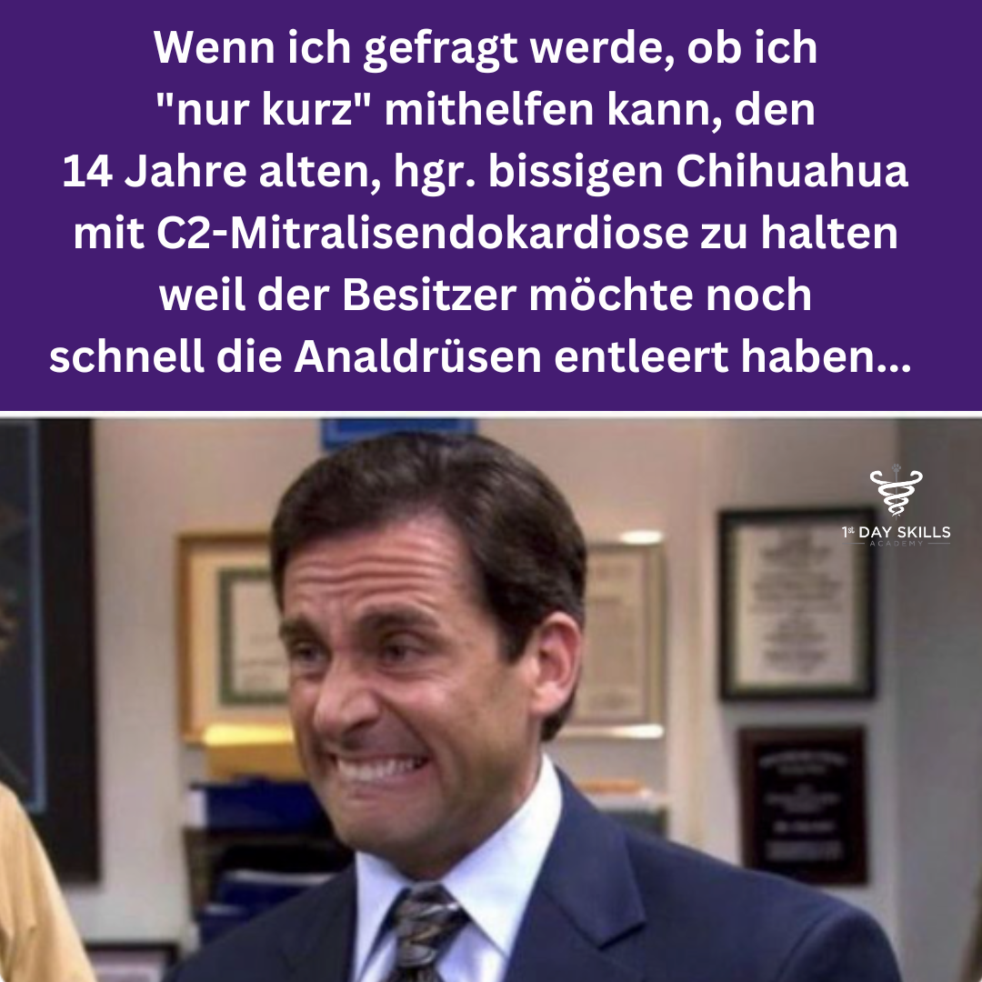 Es ist ein ungeschriebenes Gesetz, dass bestimmte Wörter, Phrasen oder gar ganze Sätze im tierärztlichen Alltagswahnsinn absolut verboten sind und mit karmischem Selbstmord bestraft werden. Neben der Feststellung: „Heute ist nichts los im Notdienst…“ wäre das unter anderem die Phrase „nur kurz“. Denn wir wissen alle, dass „nur kurz“ das diabolische Vorspiel für sämtliche denkbare als auch undenkbare Katastrophen ist…