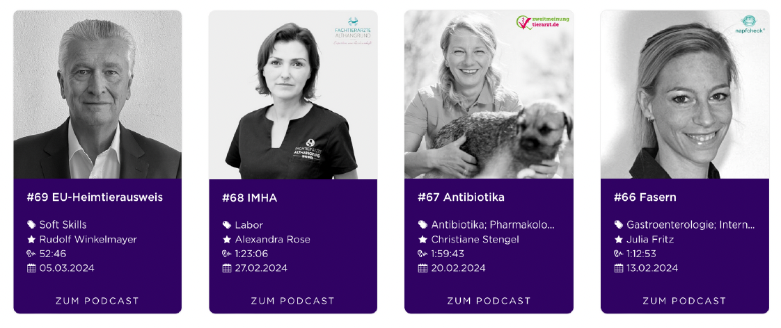 Wer hier zu noch mehr erfahren möchte, hört sich am besten die Podcast Folge #14 zum Thema „Orthopädische Untersuchung der Hintergliedmaßen“ mit DVM Pavlos Natsios, Resident ECVS und Folge #63 „Orthopädische Untersuchung der Vordergliedmaße“ mit Dr. Georg Haimel, Dipl. ECVS & Gründer der Tierarztpraxis am Stadtpark an.