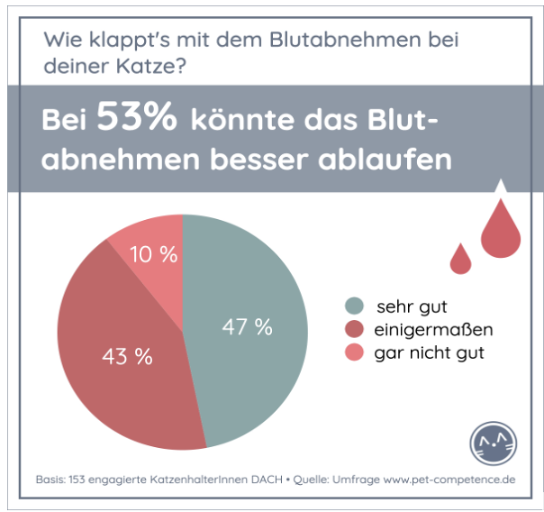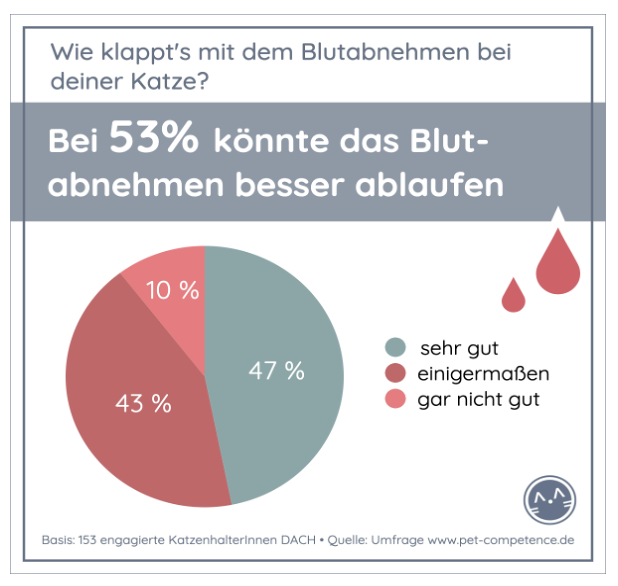 Mehrere Katzenhalter:innen beschrieben im Freitext, dass der Umgang mit ihren Tieren in der Praxis, trotz kooperativer Katze, sehr invasiv und für die Katze extrem stressig sei. Insgesamt gaben mehr als die Hälfte der Befragten an, dass es mit dem Blutabnehmen bei ihrer Katze nur einigermaßen oder gar nicht gut klappen würde. Erfreulich, dass die Mehrheit der ambitionierten Katzenhalter:innen die Möglichkeiten der Blutuntersuchung wahrnimmt. Doch es bleibt eine Herausforderung, wie man die verbliebenen Katzenbesitzer:innen dazu motivieren kann, damit Vorsorge, medizinische Versorgung und Pflege bestmöglich gelingt.