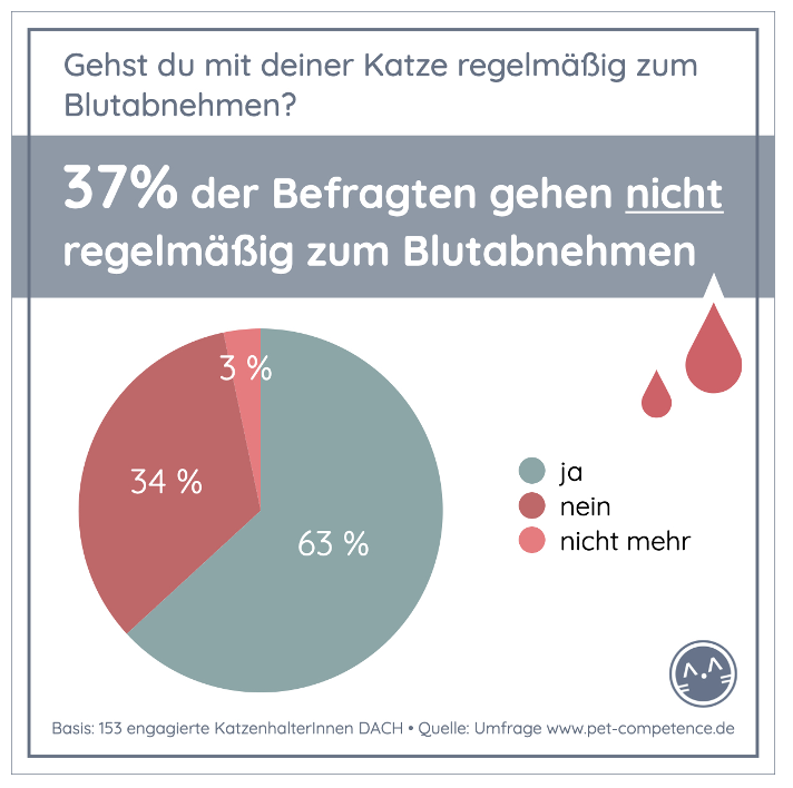 Die Zahlungsbereitschaft für die Untersuchung und gänzlich unkooperative Katzen einmal ganz außen vorgelassen: Die Erfahrungen und die Bereitschaft der Katzenhalter:innen für eine Blutuntersuchung, sind sehr unterschiedlich. Je enger die Beziehung zur Katze und je aufgeklärter der Katzenmensch, desto eher wird, allen Vorbehalten und etwaigen negativen Erfahrungen zum Trotze, die Blutuntersuchung veranlasst. Ganze 63 % der Befragten gaben an, mit ihrer Katze regelmäßig zur Blutuntersuchung zu gehen.