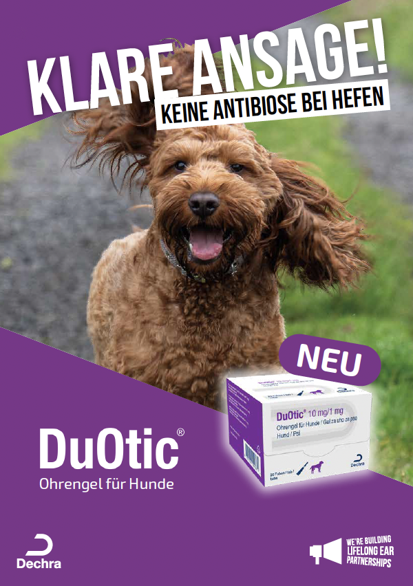 Mit dem neuen Produkt DUOTIC bringt Dechra im Juni ein topisches Präparat zur Behandlung der Otitis externa in Verbindung mit Malassezia pachydermatis auf den Markt – ohne Antibiotikum. „Das ist ein echter Meilenstein“, sagt Bolkart. „Wir reagieren damit auf den langjährigen Wunsch vieler Dermatolog:innen und Tierärzt:innen nach einer zielgerichteten Therapie bei Malassezia-Otitis.“ DUOTIC schließt damit eine therapeutische Lücke in der Otologie – vor dem Hintergrund zunehmender Antibiotikadiskussionen eine hochrelevante Innovation. Bereits vor Markteinführung haben mehr als 1.500 Praxen ihr Interesse bekundet.