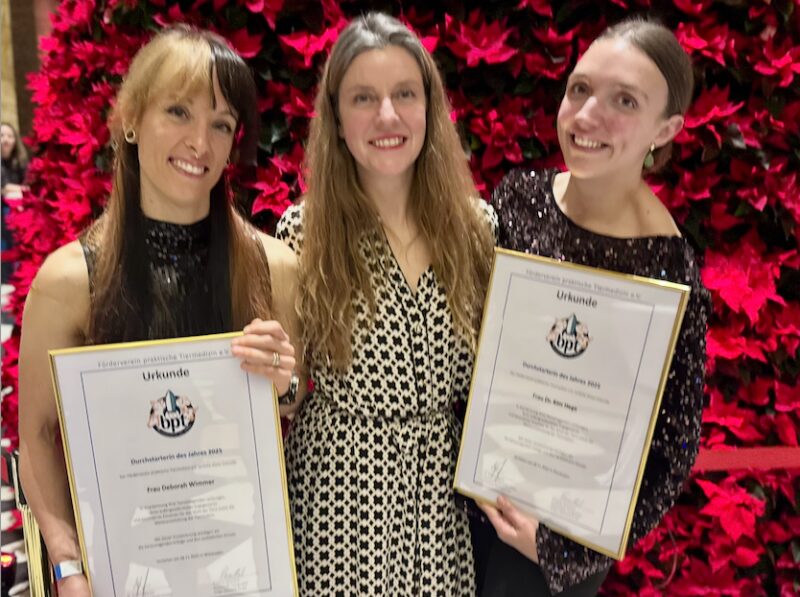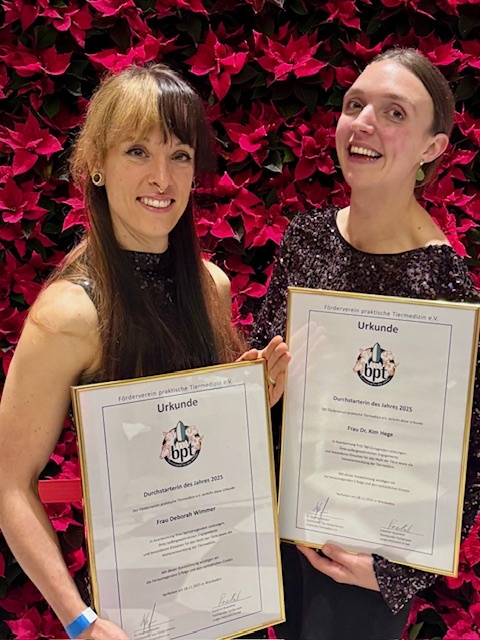 Im Rahmen des bpt-Jahreskongresses 2025 wurde erstmals die Auszeichnung „bpt-Durchstarter:in des Jahres“ an zwei junge Tierärztinnen verliehen. Mit dem Preis ehrt der Förderverein praktische Tiermedizin e.V. Tierärzt:innen in den ersten acht Berufsjahren, die durch innovative Projekte, wissenschaftliche Impulse oder besonderes Engagement einen nachhaltigen Beitrag zur tiermedizinischen Praxis leisten. Die Auszeichnung, verbunden mit einem Preisgeld von € 1.000.- für Dr. Deborah Wimmer („DOGtor Debbie“) und Dr. Kim Hege wurde von Sabrina Neusieß vom Sponsor Hill's Pet Nutrition feierlich überreicht.
