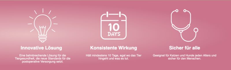 Das Tragen eines Halskragens kann für das Tier stressig sein, da er seine Sicht, seinen Geruchssinn und seine Wahrnehmung beeinträchtigt. Damit sich Hunde und Katzen während der Genesung nach einem chirurgischen Eingriff sicher, wohl und entspannt fühlen, wird der CalmDown by KRUUSE® Postoperative Knopf mit einer einfachen Klicklösung einmalig am Halskragen befestigt. Es hält mindestens 10 Tage lang, "folgt dem Tier auf Schritt und Tritt" und platziert die Pheromone, die das Stressniveau der Tiere positiv beeinflussen, direkt unter der Nase des Tieres.