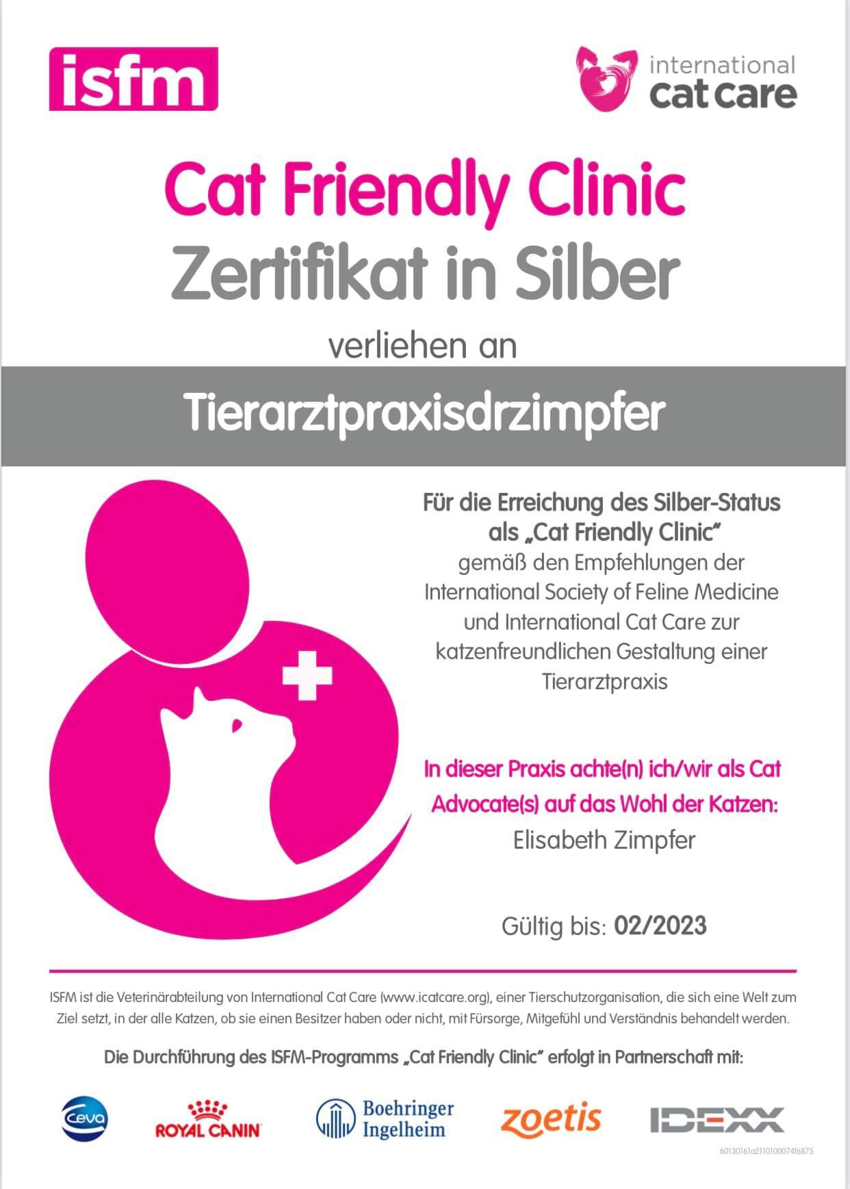 Dr. Elisabeth Zimpfer: Unser Ziel war es vom ersten Tag unserer Praxisarbeit, Tier und Mensch einen angenehmen und vor allem stressfreien Besuch in unserer Praxis in einer ruhigen Atmosphäre zu gewährleisten. Gerade Katzen und ihre Besitzer:innen sind sehr sensibel. Wir haben schon immer katzenfreundlich gearbeitet und wollen das mit dieser Zertifizierung für alle öffentlich machen.