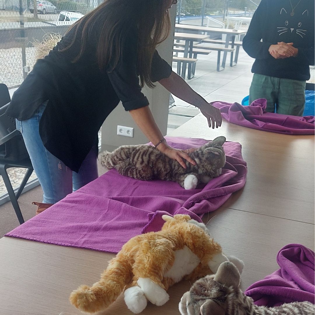 Nach Sabine Schrolls Vortrag und einer kleinen Pause wurde der Workshop interaktiv. Die Teilnehmer:innen wurden in Gruppen eingeteilt und hatten die Möglichkeit, an verschiedenen Stationen die Theorie in die Praxis umzusetzen. Eine der Stationen widmete sich dem Katzenpurrito-Wickeln, einer Catfriendly-Handling-Technik, die es ermöglicht, die Katze in ein Handtuch zu wickeln, um sie während der Untersuchung sanft zu sichern. Die Teilnehmer:innen konnten unter Lisi Baszlers Anleitung an Stoffkatzen ausprobieren, wie man diese Methode anwendet.