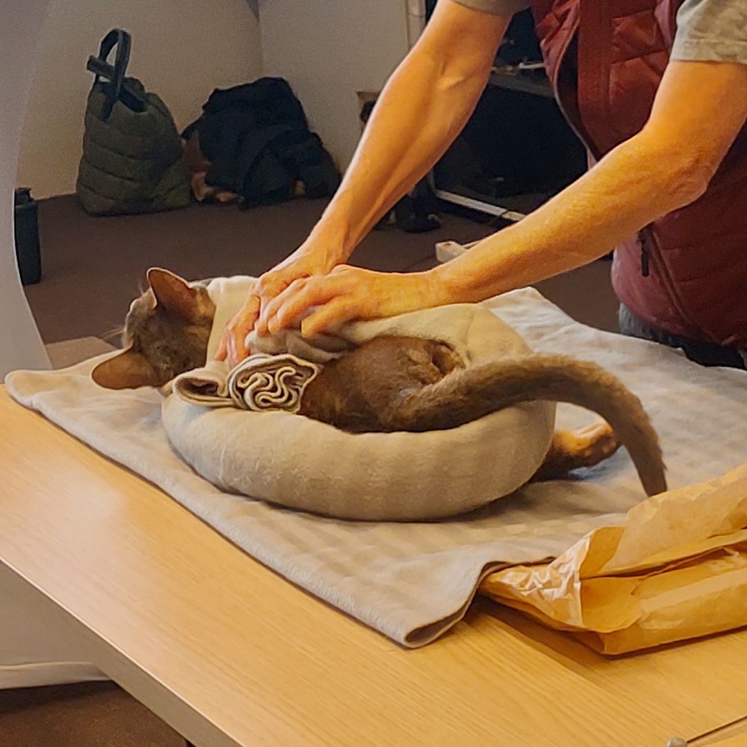 Mit dieser Motivation und dem wertvollen neuen Wissen im Gepäck habe ich meine nächsten Dienste in der Ordination gestartet und konnte es kaum erwarten, die catfriendly-handling Techniken in der Praxis auszuprobieren. Und tatsächlich waren die Ergebnisse durchwegs positiv. Der „Katzenkringel“, eine zusammengerollte Decke, die als Begrenzung auf dem Untersuchungstisch dienen soll, hat tatsächlich dafür gesorgt, dass die Katzen es sich gemütlich gemacht haben und es nicht notwendig war, sie festzuhalten. Die Katzen reagierten viel entspannter auf die Untersuchungen, und auch die Besitzer:innen waren begeistert, wie ruhig und stressfrei ihre Tiere behandelt wurden. Es ist beeindruckend zu sehen, wie sich mit einfachen und unkomplizierten Maßnahmen so viel bewirken lässt und dadurch das Wohl der Katzen und die Zufriedenheit der Besitzer:innen gesteigert wird.