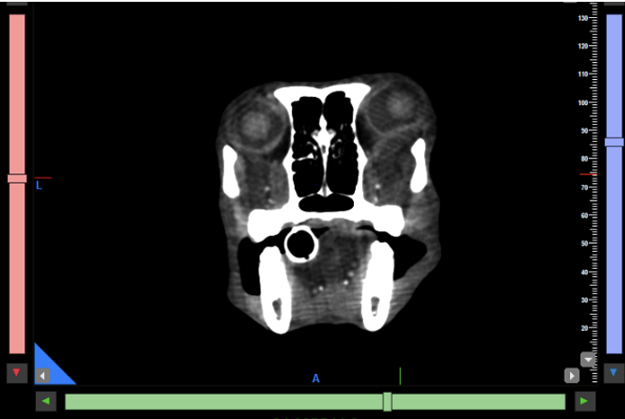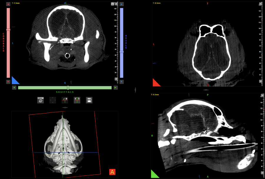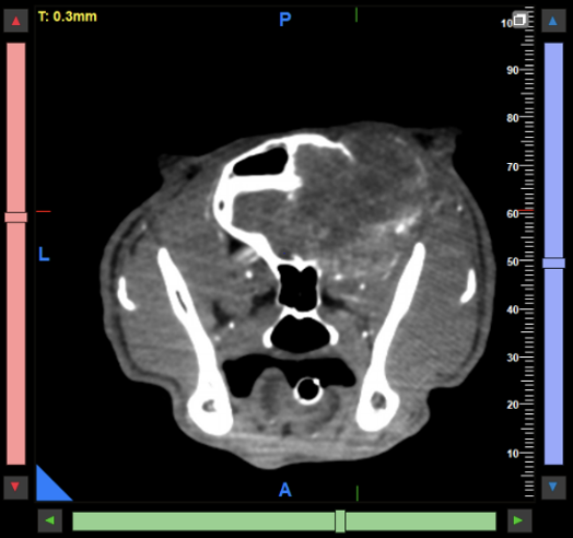 Kopf und Hals: Tumoren im und am Kopf lassen sich mit dem CBCT sehr präzise darstellen. Neben der exzellenten Beurteilung knöcherner Invasionen können auch Weichteilanteile zuverlässig abgegrenzt werden, was insbesondere für die präoperative Planung relevant ist. Kiefer- und Zahntumoren sowie komplexe dentale Erkrankungen profitieren weiterhin von der hohen Ortsauflösung des CBCT, die in diesen Bereichen einem klassischen Slice-CT überlegen sein kann. Bei brachycephalen Patienten hat sich das präoperative Dental-CT als Standard etabliert und ersetzt häufig eine Vielzahl konventioneller Dentalröntgenaufnahmen (Abb. 1 & 2).