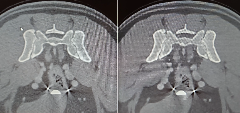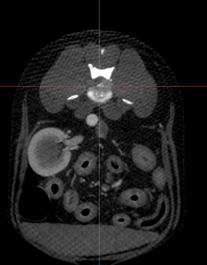 Abdomen: Ein wesentlicher Schwerpunkt unserer klinischen Arbeit liegt im Abdomen. Neben der Darstellung abdominaler Tumoren und struktureller Organveränderungen konnten auch Gefäßanomalien wie portosystemische Shunts erfolgreich dargestellt werden. Für viele klar definierte Fragestellungen stellt das CBCT eine praktikable und diagnostisch wertvolle Alternative zum MSCT dar (Abb. 5 & 6).