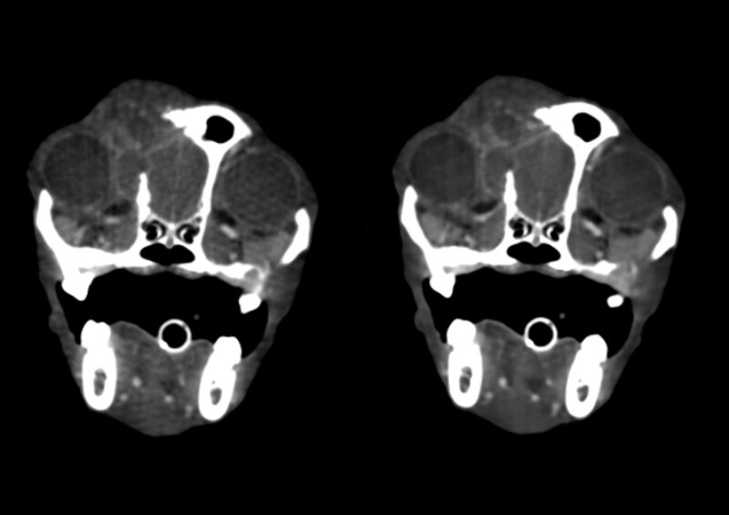 Vergleichende Darstellung eines KI optimierten Kopfscans einer Katze mit einem destruktiven Tumor im Kopfbereich (links original, rechts KI gestützt).