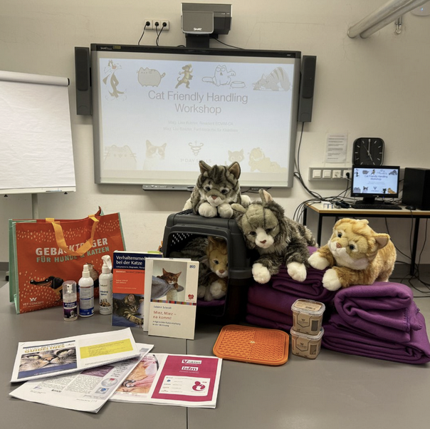 Unsere beliebten Catfriendly Handling Workshops waren wieder in Sekundenschnelle im VetSim an der Vetmeduni Vienna ausgebucht. Mit einem Theorieteil von Lisa Kulmer und mir und dem darauf aufbauenden Trockentraining mit unseren neuen Stoffkatzen konnten unsere Teilnehmer:innen u.a. die Purrito-Wickeltechnik üben. Vet-Concept hat uns tolle Goodie-Bags zusammengestellt. (Bild: Catfriendly_Handling_Workshop_1DSA.jpg)