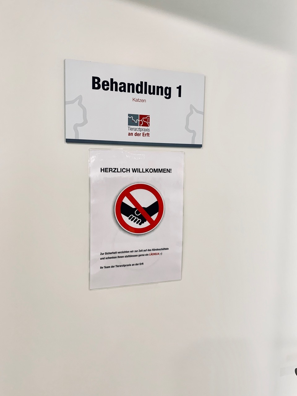 • Wie weisen wir unsere Kunden darauf hin, dass Händeschütteln auch in der Tierarztpraxis gefährlich ist und vermieden werden muss?
