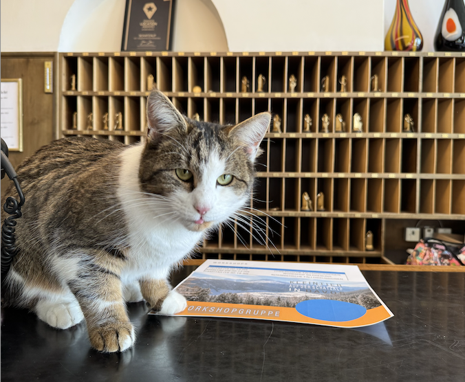 Ob es stimmt oder nicht, tut nicht wirklich etwas zu Sache. Fest steht, dass die Besucher:innen, wenn sie erst einmal mit der Seilbahn, den charmanten, in die Jahre gekommenen Jugendstilbau an der Bergstation erreichen, eine andere Welt betreten. Die ehemals fortschrittlichste Heilstätte der Region verströmt Ruhe, die Hotelmitarbeiter:innen schaffen eine heimelige Atmosphäre, die noch durch die zahlreichen Katzen, die dort frei umhergehen, unterstützt wird. Dass es zuvor geschneit hat und auch noch die Sonne strahlt, erfreuen die beiden Organisator:innen der Tagung, Mag. Karin Burgener-Degasperi und Prof. Dr. Iwan Burgener.