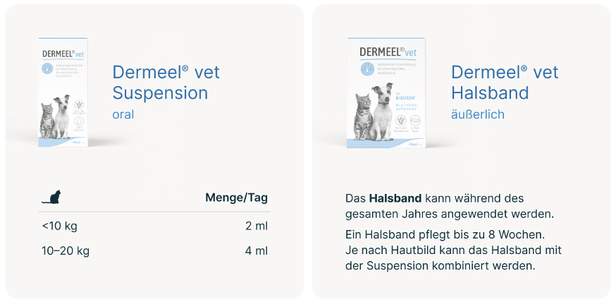 Die Dermeel® vet Suspension ist für Katzen in der Packungsgröße mit 120 ml erhältlich und zeichnet sich durch eine hohe Akzeptanz aus. Die Dosierung erfolgt gewichtsabhängig mit der beiliegenden Dosierspritze. Das Dermeel® vet Halsband kann dauerhaft getragen werden und ein Halsband pflegt die Haut bis zu 8 Wochen. Eine spezielle Sollbruchstelle sorgt dafür, dass auch Katzen im Freigang das Halsband sicher tragen können. Eine Kombination mit der systemisch unterstützenden Suspension ist je nach Hautbild möglich.