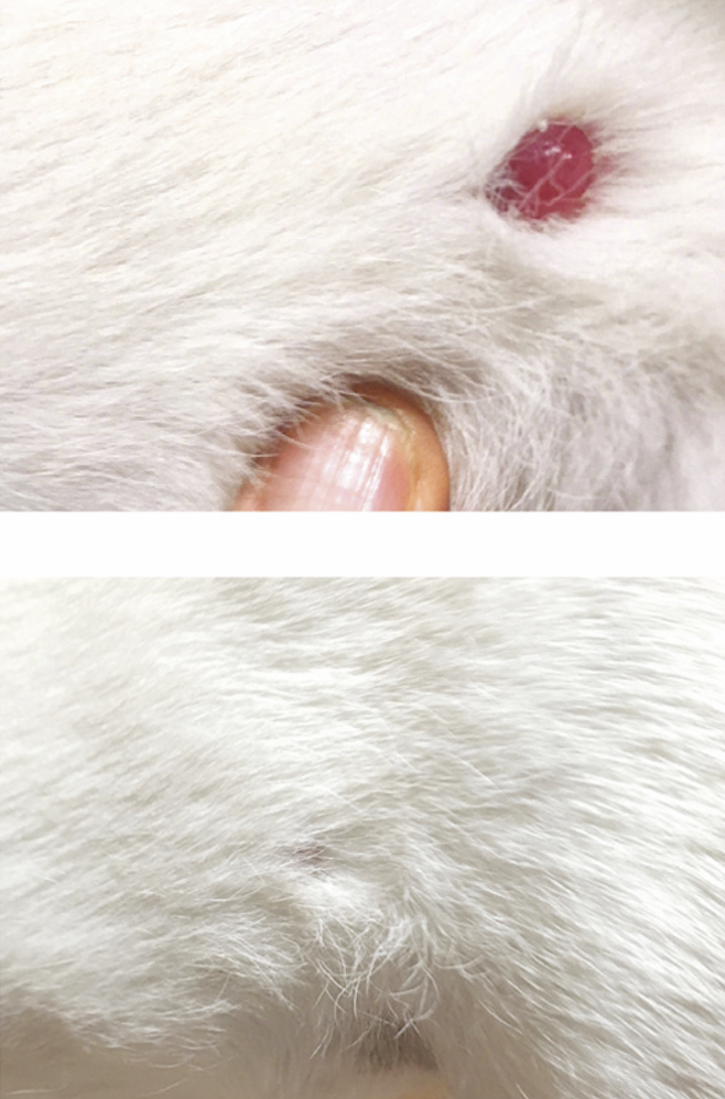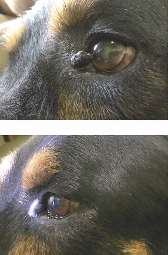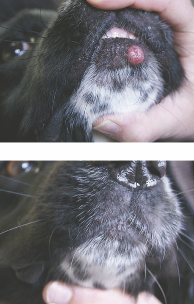 Bis zu einer Größe von ca. 1,5 cm haben wir sehr gute Erfahrungen gemacht, auch bei ganz kleinen Geschichten, zum Beispiel am Lidrand. In solchen Fällen sedieren wir das Tier nur ein bisschen, brauchen aber keine Narkose. Etwas schwieriger wird es bei einer Größe ab 2 cm. Das kriegen wir mit dem Vereisen nicht ganz weg. Aber auch solche Umfangsvermehrungen konnten wir zumindest auf dem gleichen Level halten, teils sogar verkleinern oder die Herde schließen.