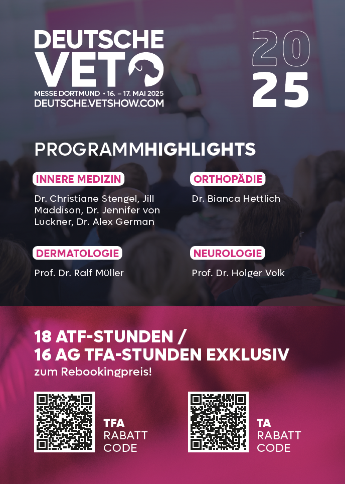 Am 16. und 17. Mai 2025 öffnet die DeutscheVET in Dortmund ihre Türen und lädt Tierärzt:innen und TFAs zu zwei intensiven Tagen voller fachlicher Weiterbildung, praktischer Workshops und umfassender Networking-Möglichkeiten ein. Die DeutscheVET 2025 punktet auch in diesem Jahr mit einem von Prof. Dr. Holger Volk (TiHo Hannover) kuratierten Programm. Dieses deckt die wichtigsten Trends und Herausforderungen in der Veterinärmedizin ab – von Dermatologie über Qualitätsmanagement bis hin zur Inneren Medizin, Anästhesie und Neurologie. Besonders wertvoll: Wer sich weiterqualifizieren möchte, kann gleich 18 ATF-Stunden oder 16 AG TFA-Stunden sammeln.