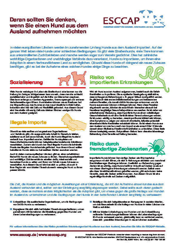 Aspekte der Sozialisierung oder illegale Importe sind vor der Aufnahme von Hunden aus dem Ausland zusätzliche Aspekte, die zu berücksichtigen sind – eine Aufklärung in diesem Bereich ist also wichtig. Das diesbezügliche ESCCAP-Factsheet ist kostenfrei und kann im Bereich „Servicematerial“ auf www.esccap.de heruntergeladen werden.