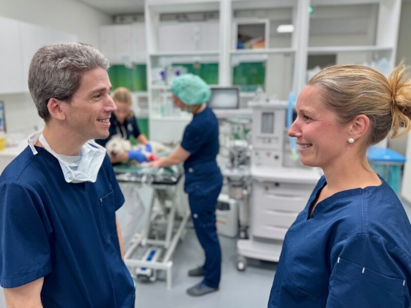 Ein zentrales Element des Erfolgs ist die Kommunikation – nach innen wie nach außen. In einem Überweisungszentrum, in dem täglich komplexe Fälle behandelt werden, entscheidet sie oft über den Verlauf eines Patienten. „Gute Medizin entsteht im Dialog“, sagt Dr. Thekla Bogenhagen. „Zwischen Chirurg:innen, Bildgebung, Internist:innen, Station und Verwaltung – aber genauso mit den überweisenden Kolleg:innen, die uns ihr Vertrauen schenken.“ Im Fachzentrum wird Kommunikation als aktiver Prozess verstanden: Kollegiale Übergaben, kurze Feedbackschleifen, strukturierte Fallbesprechungen und ein offener Austausch mit den Überweisungspraxen gehören zum Alltag. Ziel ist es, Patient:innen sicher und reibungslos durch Diagnostik, OP und Nachsorge zu führen sowie gleichzeitig Transparenz und Vertrauen zu schaffen. „Wir wissen, dass gute Zusammenarbeit auf gegenseitigem Verständnis beruht“, ergänzt Ludo Stegen. „Wenn alle Beteiligten auf Augenhöhe miteinander sprechen, profitieren am Ende vor allem die Tiere.“