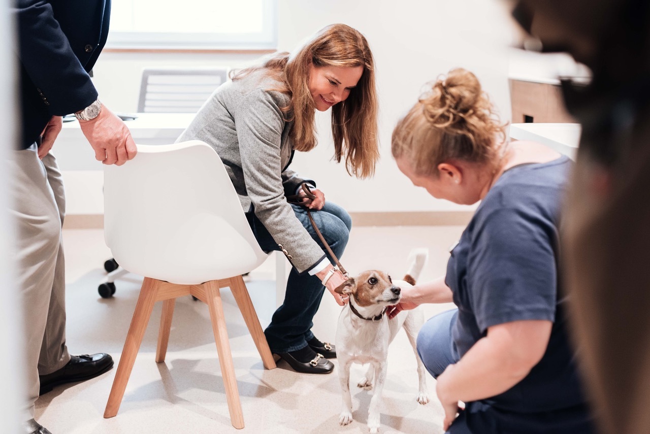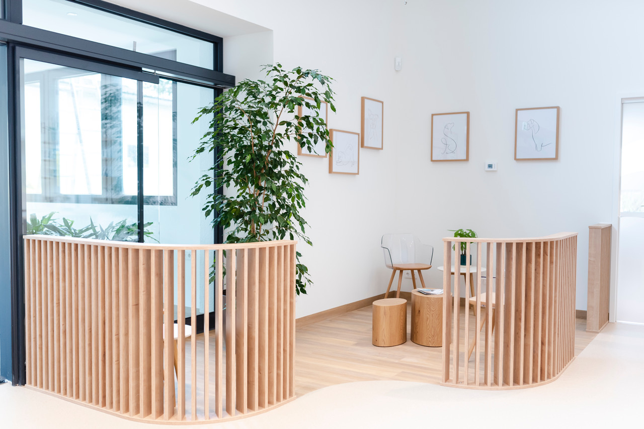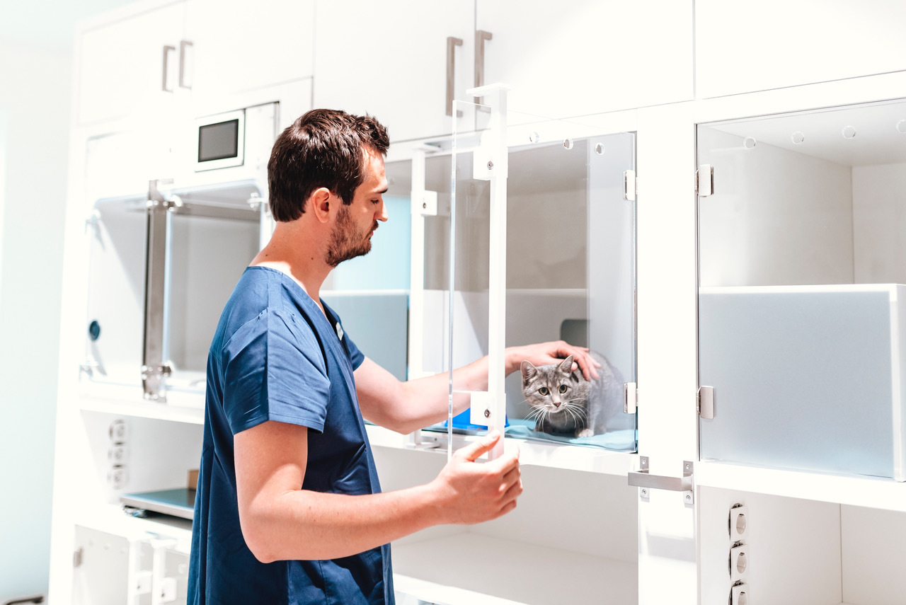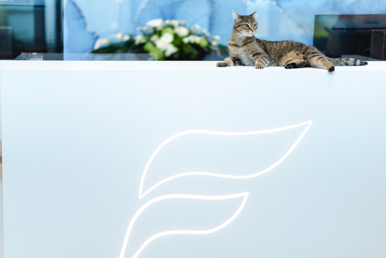 Großzügig, hell und einladend ist der Empfangsbereich in der neuen Überweisungspraxis. An der Theke wird man von Damen empfangen, die ihre Kommunikationsstärken früher unter anderem in der Verwaltung oder in der Hotelbranche gelernt haben. "Die Patientenbesitzer:innen sollen sich bei uns wohlfühlen und möglichst entspannen", erklärt Anna Adrian. Es gibt einen Wartebereich für Hunde und einen für Katzen, so dass auch bei den Tieren der Stress reduziert wird. "Bereits bei der Planung haben wir alle Voraussetzungen umgesetzt, um uns in naher Zukunft als "Catfriendly clinic" zertifizieren zu lassen", so Adrian weiter. In den fünf Untersuchungsräumen, wobei einer rein für Katzen reserviert ist, finden auch die Aufklärungsgespräche mit den Besitzer:innen statt. Die Diagnostik und Therapie findet dann ohne den Besitzer statt. Oft sind die Patienten weniger gestresst und ängstlich und die Tierärzt:innen können sich so besser auf Ihre Arbeit konzentrieren. "Natürlich klären wir die Besitzer:innen ausführlich auf", sagt Pieter Nelissen, "das ist uns sehr wichtig!"