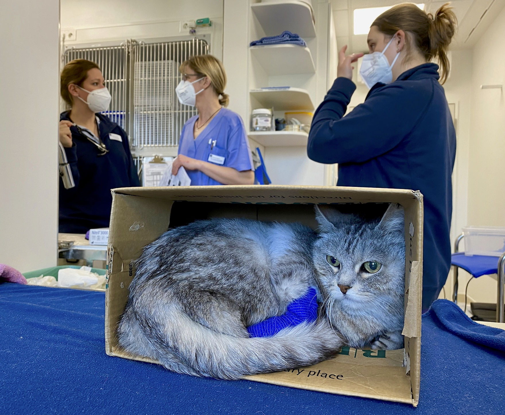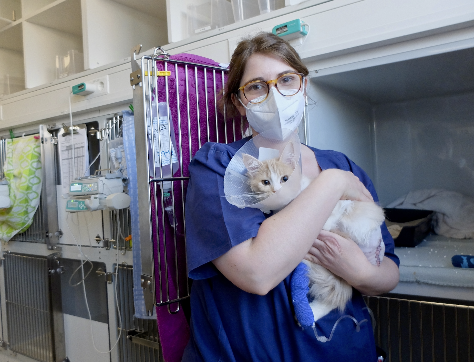 In den Kliniken, in denen ich früher gearbeitet habe, wurden die Katzenpatienten immer stiefkindlich behandelt, und da ich ein Herz für die Benachteiligten habe, habe ich mich um die Katzen gekümmert und mich in die Katzenmedizin eingearbeitet. Nachdem ihre vier Kinder aus dem Gröbsten raus waren, kam sie zurück in die Arbeit, traute sich aber nicht mehr zu, Sprechstunde zu machen und in den direkten Kontakt mit den Besitzer:innen zu treten. Auf Station konnte sie sich der Tiermedizin wieder nähern, doch wurden damals auch in Hofheim stiefkindlich behandelt. Die Katzenstation, in der permanent beruhigende Musik gespielt und mit beruhigenden Pheromonen gearbeitet wird, hat sich dann Schritt für Schritt zu einer "Oase" entwickelt. Die Patienten werden hier nach den Operationen in speziellen katzenfreundlichen Käfigen inklusive dunklem Rückzugsort und Katzentoilette untergebracht. Und natürlich haben andere Tiere außer Katzen hier keinen Zugang. "Wir tun hier alles, um Stress zu vermeiden und unseren Patienten eine ideale Regeneration zu ermöglichen", fasst die Oberärztin zusammen.