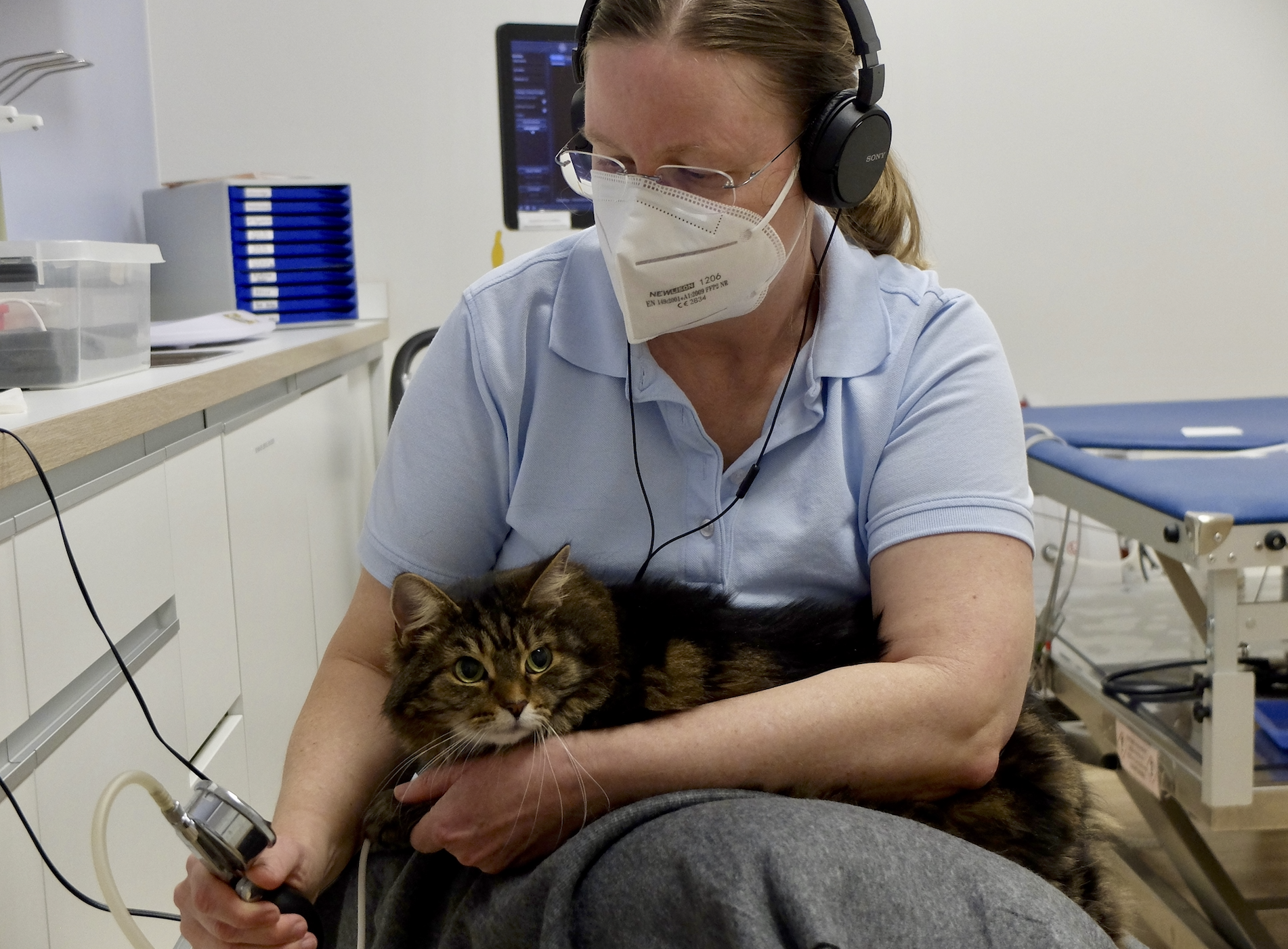 Die Fachtierärztin für Klein- und Heimtiere, Dr. Imke März ist seit 2021 Oberärztin der Hofheimer Kardiologie. Ich treffe sei, während sie mit absoluter Ruhe den Blutdruck einer Katze misst. Auf die Frage, was sie sich an Verbesserungen für ihren Arbeitsplatz wünscht, sagt sie: "Wir machen hier in Hofheim schon sehr viel sehr richtig! Dennoch wünsche ich mir mehr katzenaffine Kolleg:innen, weil es Arbeit deutlich vereinfachen würde." Darüber hinaus würde sie den Katzenbehandlungsraum ans hinterste Ende des Ganges legen, da die Katzen auf jedes noch so leise Geräusch reagieren und sich dies negativ auf die Ergebnisse der Blutdruckmessung bemerkbar macht. Sie hofft, dass über Katzen, deren Krankheiten und Verhalten in Zukunft noch viel mehr geforscht wird. "Wir wissen noch viel zu wenig über die Katzen, die eben keine kleinen Hunde sind", erklärt die Kardiologin, die trotzdem froh ist, dass sich immer mehr Praxen und Kliniken als Cat Friendly Clinic zertifizieren lassen. Sie sagt, dass Katzen schwerer einzuschätzen sind und fügt das Beispiel eines herzkranken Hundes an, dessen Besitzer:innen bei der Hunderunde erkennen, dass es ihrem Vierbeiner schlechter geht. Der Besuch beim Tierarzt erfolgt bei Hunden deutlich früher als bei Katzen, deren Aktionsradien ihren BesitzerInnen in der Regel gar nicht bekannt sind. "Hier ist noch sehr viel Aufklärungsarbeit notwendig, auch was die Psyche der Tiere angeht!", so die Tierärztin.