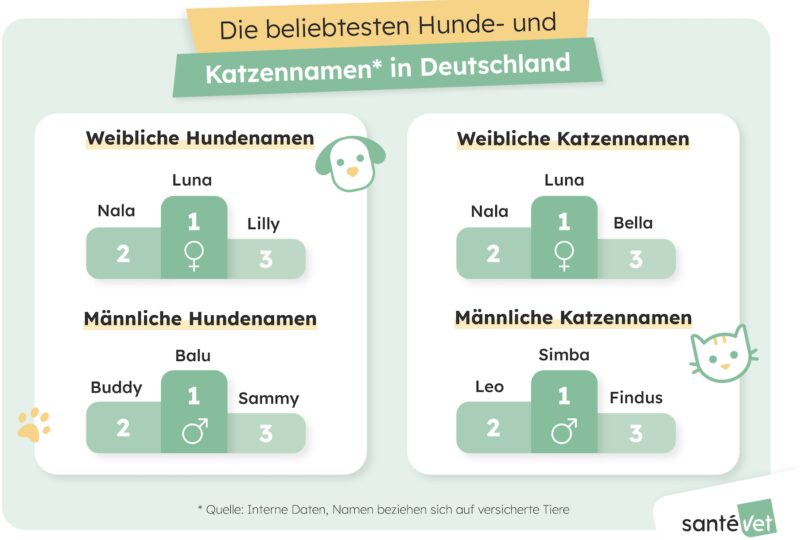 Die Trends bei den Namen für Haustiere in Deutschland enthüllen, dass Kater am häufigsten auf die Namen Simba, Leo und Findus hören, während Buddy, Balu und Sammy die Favoriten bei männlichen Hundenamen sind. Bei Hündinnen führen Stella, Lucy und Lola die Liste der Namen an. Bei Katzen sind die Namen Luna, Bella und Nala am beliebtesten. In Bezug auf die am häufigsten versicherten Rassen steht bei den Katzen die Europäische Kurzhaar im Fokus, während bei den Hunden der Labrador den Spitzenplatz einnimmt.