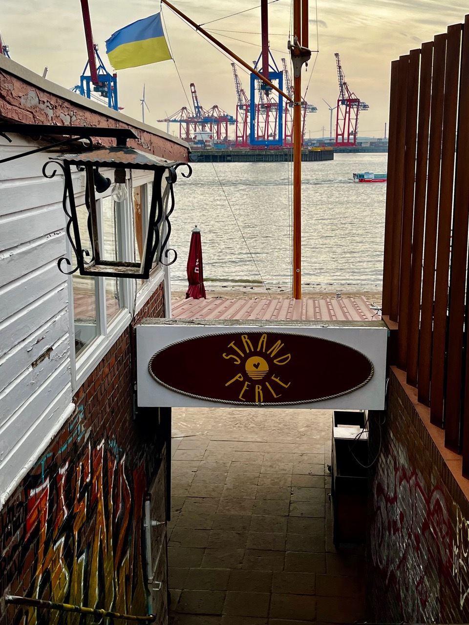 Zum Abschluss der Hunderunde gab es noch einen Pott Kaffee auf der Terrasse der berühmten "Strandperle", wo sich die Hamburger:innen im vergangenen Jahrhundert schon einen Becher Milch gönnten und danach in langen Badekleidern ganz züchtig ein Bad im Fluss nahmen. Zum Baden war es im Februar definitiv zu kalt, so dass wir uns mit schwarzem Kaffee und einem Blick auf die vorbeifahrenden Ozeanriesen begnügt haben.
