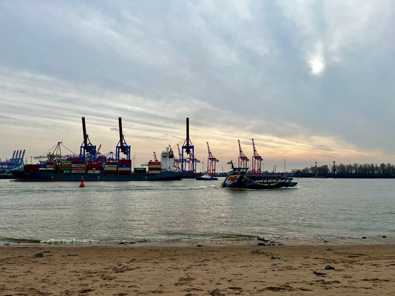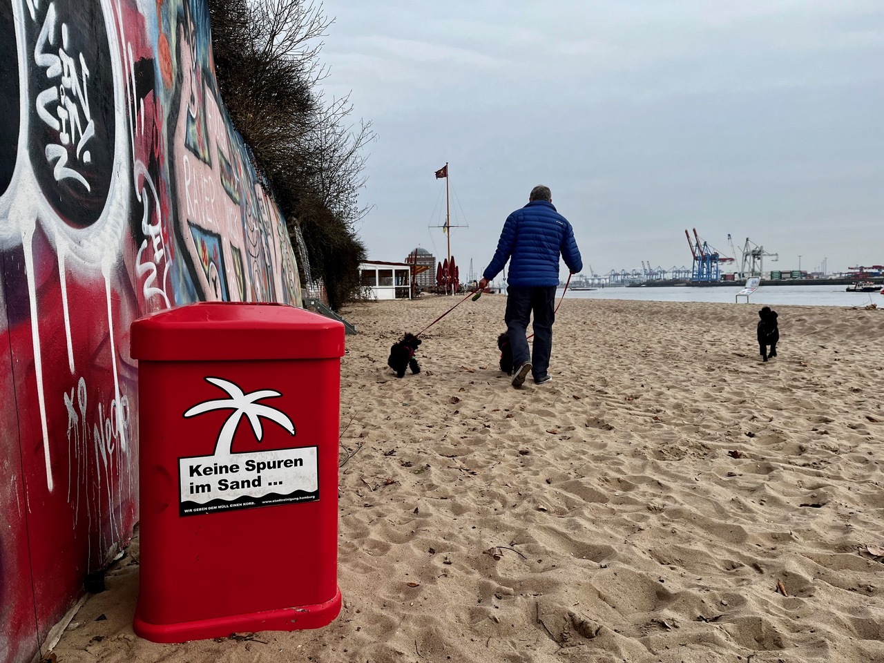 Das Wetter zeigt sich an diesem Februartag von seiner typischen Seite. Das viel beschworene Hamburger Schietwetter mit einer leichten Brise, feinem Spray und einigen wenigen Sonnenstrahlen, die die dichte Wolkendecke durchdringen, hält die Touristen davon ab, auf der schönsten Meile der Hansestadt zu flanieren. Einheimische und Urlauber:innen nutzen den kilometerlangen Strand an der Elbe bei schönem Wetter zum Spazierengehen, um die riesigen