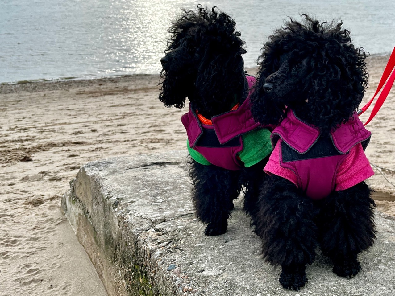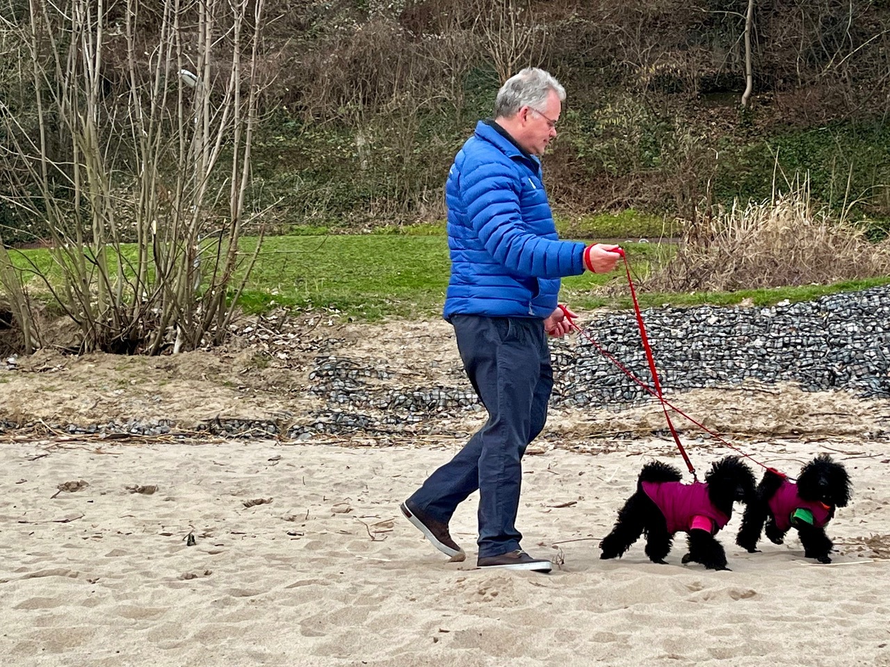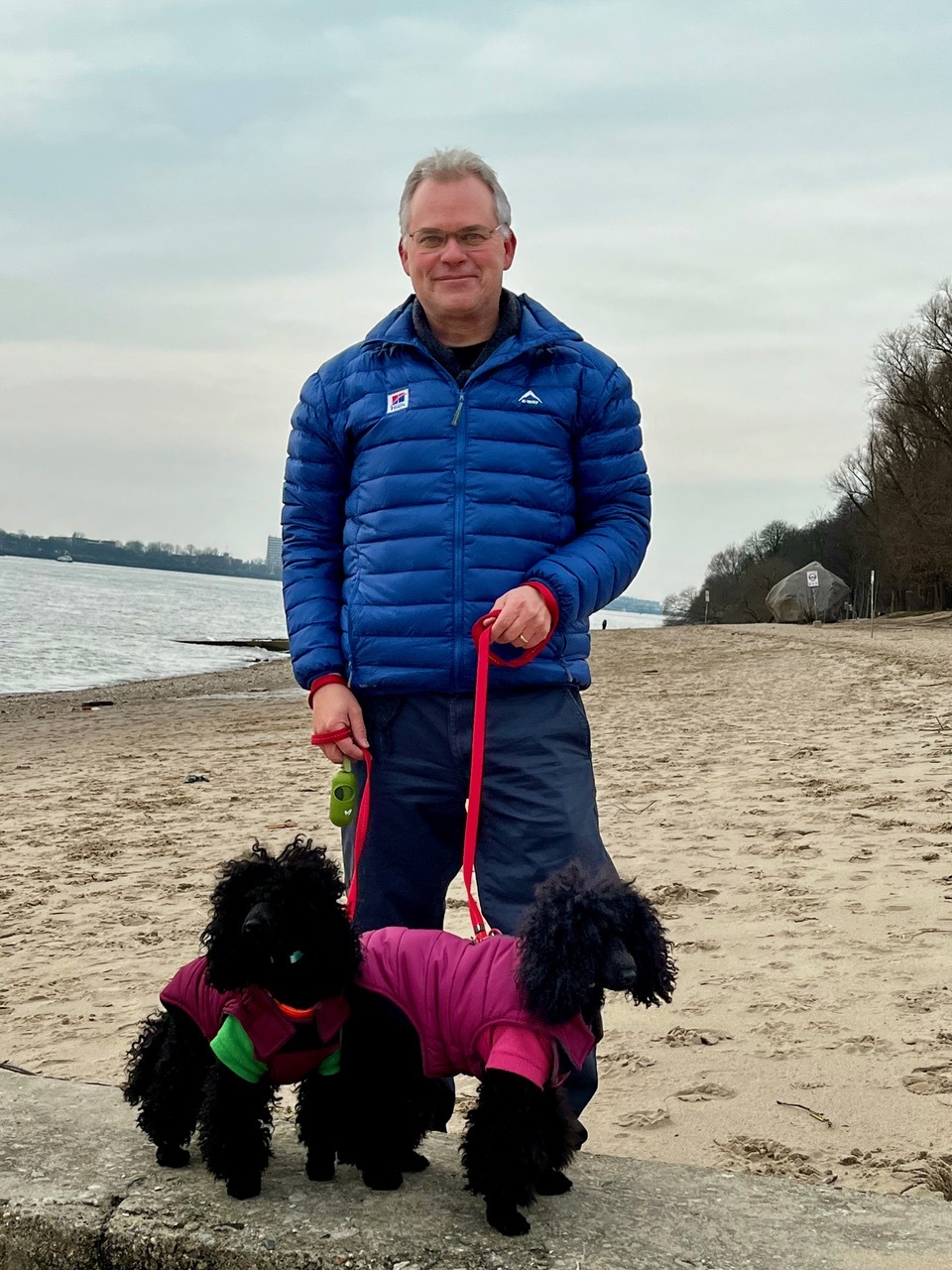 Container-Schiffe im Hafen zu bestaunen oder um ein Picknick im Sand zu veranstalten. Dem Wetter sei Dank bleibt an diesem Tag viel Platz für die Hunde. Die beiden Pudeldamen, Chica & Lola, sind jedoch noch ein wenig unsicher auf dem ungewohnten Geläuf und haben sich noch nicht vollkommen an die neue Heimat gewöhnt. Den beiden Vierbeinern steckt noch ein bisschen der Reisestress in den Knochen, den sie auf dem langen Flug nach Südafrika nach Deutschland erlebt haben. "In Südafrika haben wir uns dazu entschlossen, unsere Familie um zwei Hunde zu erweitern", erklärt Martin Schellert, der sich bei seinen Kolleg:innen Tipps einholte, welche Rasse denn am besten zu ihren passen würde. Pudel waren ursprünglich apportierende Jagdhunde, die auf Wasserjagd spezialisiert waren und das erlegte Federvieh aus den Seen holen mussten. "Ich schätze die beiden besonders, weil sie sehr intelligente und mit einem großen Beschützerinstinkt ausgestattete Familienhunde sind", so der Tierfreund.