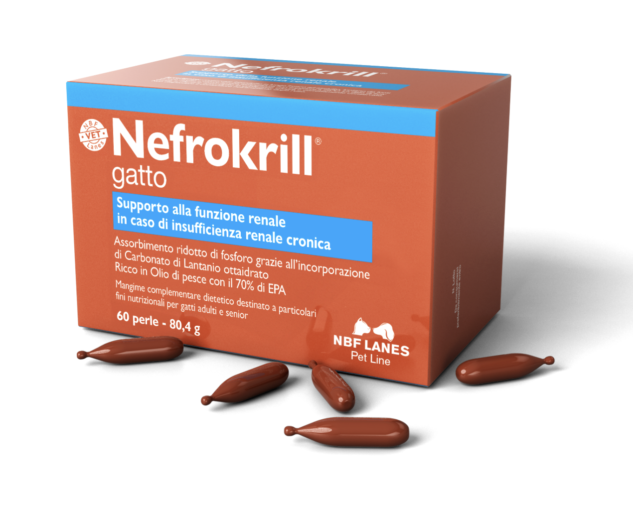 4. Nefrokrill cane e gatto ist ein Ergänzungsfuttermittel, das die Nierenfunktion bei Hunden und Katzen gezielt unterstützt. Das Produkt enthält den starken Phosphatbinder Lanthancarbonat, der die Aufnahme von Phosphat aus dem Verdauungstrakt reduziert und so hilft, das Kalzium-Phosphor-Gleichgewicht im Körper zu erhalten. Zusätzlich enthält Nefrokrill cane e gatto Omega-3-Fettsäuren aus Krillöl, die entzündungshemmend wirken und die Nieren schützen, sowie Vitamin E als starkes Antioxidans.