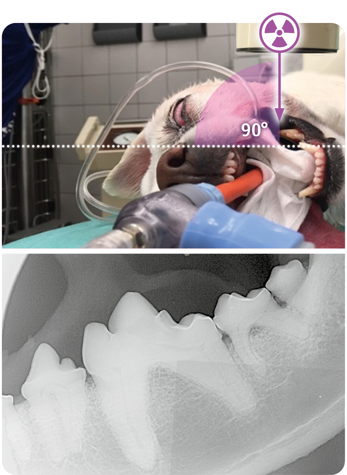 Hier wird das Tier in Seitenlage gebracht, der Kopf ist parallel zur Unterlage. Die Speicherfolie liegt in der Maulhöhle parallel zur Zahnebene und der Röntgenstrahl trifft die Speicherfolie im 90° Winkel (Abb. 1).