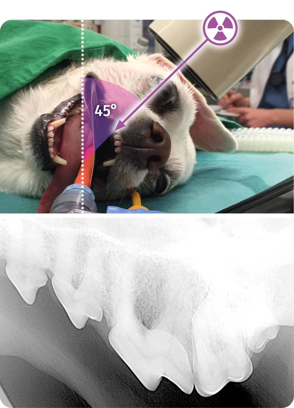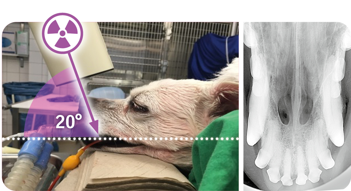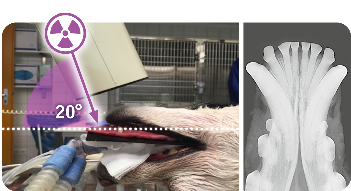Auch hier ist das Tier in Seitenlage, der Kopf ist parallel zur Unterlage. Die Speicherfolie liegt in der Maulhöhle parallel zum Gaumen. Der Röntgenstrahl trifft die Speicherfolie im 45° Winkel (Abb. 2).