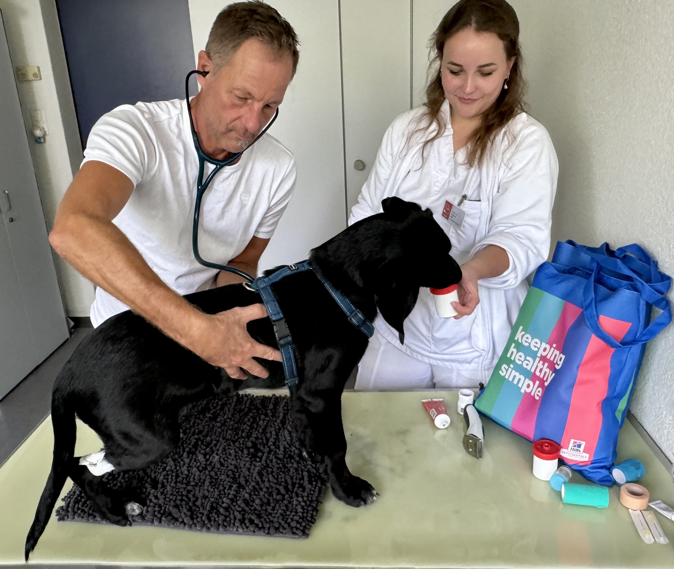 Die Mittagspause verbringe ich mit Peter Kook in der Tierspital Mensa, wo sich mittags alle Studierende und Mitarbeitende treffen. Hier wird nicht nur Wert auf ein gesundes und leckeres Essen gelegt, hier wird auch ein besonderes Augenmerk auf die nachhaltige Produktion der Speisen geachtet. Der Tierarzt klärt mich während des Mittagessens über das Mikrobiom auf, die im Darm von Hunden und Katzen lebenden Mikroorganismen, die das Immunsystem unterstützen, Nährstoffe nutzbar machen und die Ansiedlung krankmachender Keime verhindern. "Doch steht die tiermedizinische Forschung auf diesem Gebiet erst am Anfang, es bleibt noch viel zu tun", erklärt Peter Kook, der mich nach dem Mittagessen zu Tierärztin Dajana Birk bringt, die an diesem Nachmittag zwei an der Langzeitstudie "Growing Dog Project" teilnehmende Hunde nebst Besitzer:innen zu Gast hat.