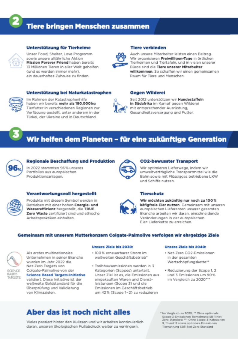 Zwei unserer Produktionsstätten sind LEED-zertifiziert, was gewährleistet, dass die dort hergestellten Produkte gemäß den damit einhergehenden Richtlinien besonders energie- und ressourceneffizient sind. Ein weiteres zentrales Ziel unserer Unternehmensstrategie ist es, bis 2030 den gesamten Energiebedarf für unsere weltweiten Geschäftsaktivitäten zu 100 % aus erneuerbaren Quellen zu beziehen. Besonders stolz sind wir darauf, dass Colgate-Palmolive, einschließlich Hill's, im Jahr 2022 als erstes multinationales Unternehmen in unserer Branche die “Net-Zero” Ziele durch die unabhängige Science Based Targets-Initiative validiert wurden. Diese Initiative repräsentiert den weltweiten Goldstandard für die Überprüfung und Bestätigung von Klimazielen. Es unterstreicht unser Engagement für umweltfreundliche Praktiken und bestätigt die Wirksamkeit unserer Maßnahmen zur Reduzierung unseres ökologischen Fußabdrucks.