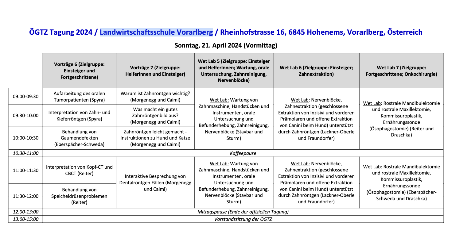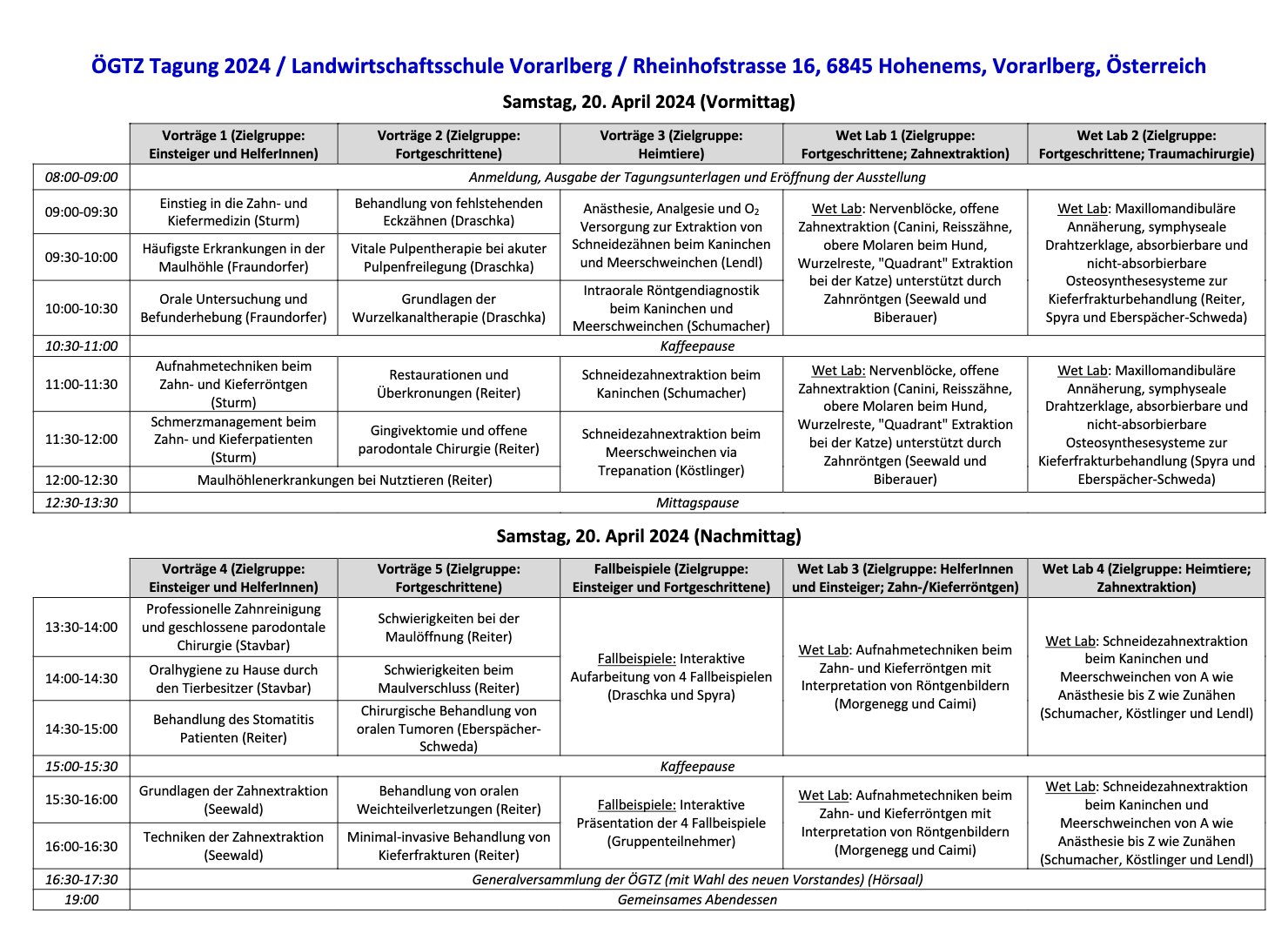 Die Kosten für Tierärzt:innen belaufen sich € 730.- (Mitglieder der ÖGTZ), bzw. € 780.- (Nicht-Mitglieder). Im Preis sind 3 Veranstaltungen (1 Wet Lab und 2 Vortragsblöcke - Fallbeispiele gelten als Vortragsblock) und das Galadinner enthalten.