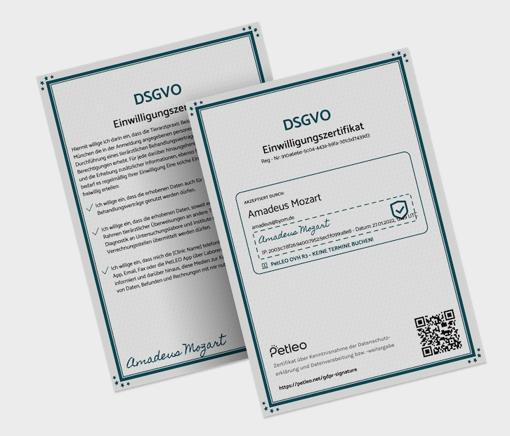 Ein rechtssicheres digitales Zertifikat wird den Tierärzt:innen dann direkt zur Verfügung gestellt - je nach Praxismanagement-System können die Kunden- und Patientendaten direkt mit wenigen Klicks übernommen werden. Ein Einscannen und Abheften ist mit dieser Lösung nicht mehr notwendig. In aller Offenheit darf man aber nicht vergessen, dass in diesem Zusammenhang ein „Disclaimer“ nicht verschwiegen werden darf: „Die Erhebung von Daten über ein DSGVO-konformes Formular allein reicht nicht aus. Auch alle nachgelagerten Prozesse in der Praxis müssen den Anforderungen der DSGVO entsprechen.“ Auch hier zeigt sich PetLEO partnerschaftlich und bietet gemeinsam mit HeyData ein Angebot, das sich der Thematik ganzheitlich annimmt.