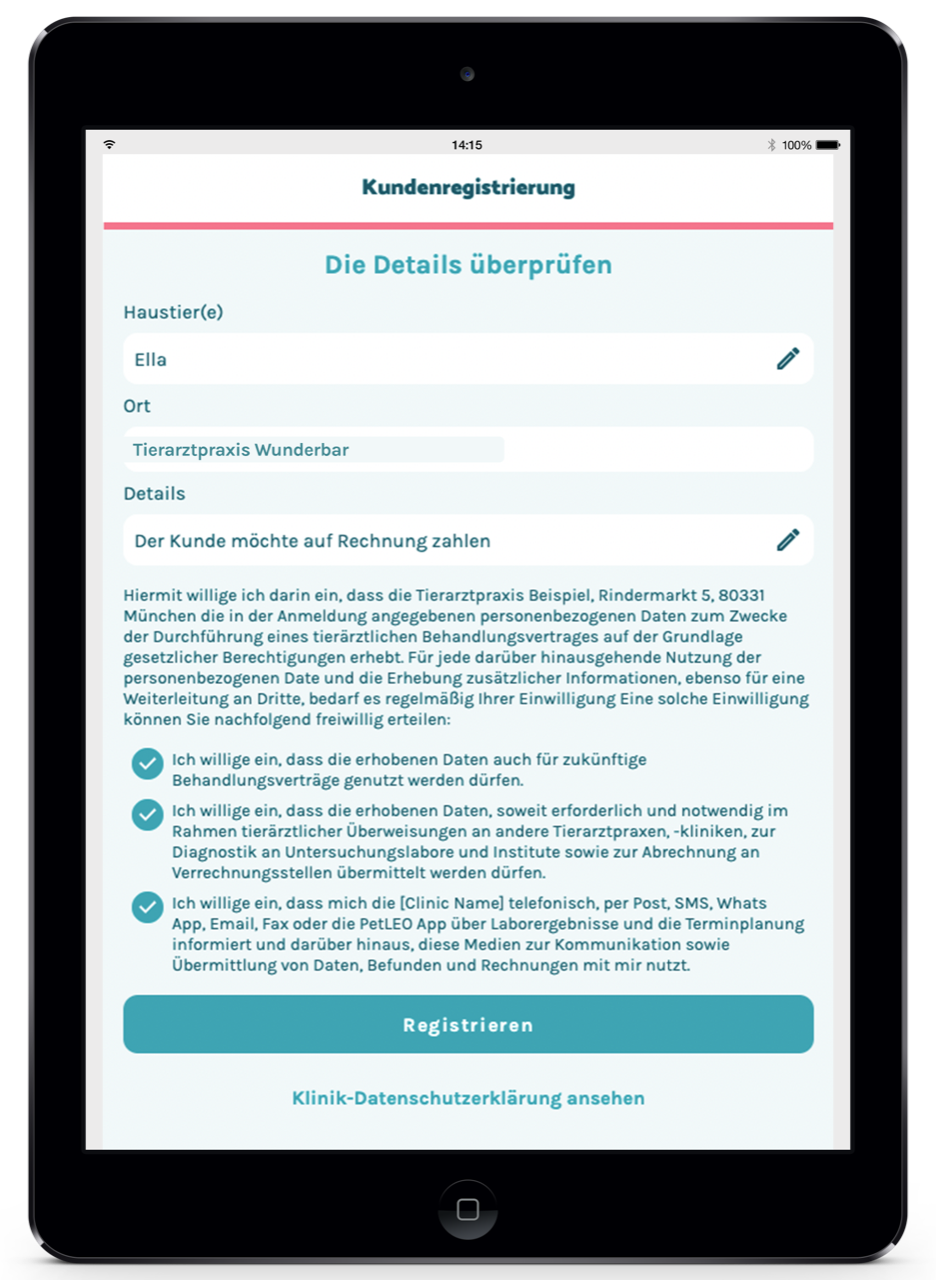 Kund:innen und Neukund:innen können mit ihrem eigenen Endgerät (Smartphone, Tablet oder PC) selbstständig alle Daten zur Person und zum Patienten eingeben. In der Folge wird dann rechtskonform den praxisindividuellen Bestimmungen zum Datenschutz, dem Behandlungsvertrag, der Datenweitergabe an Dritte und der Werbeerlaubnis zugestimmt, bzw. diese auch ablehnt.