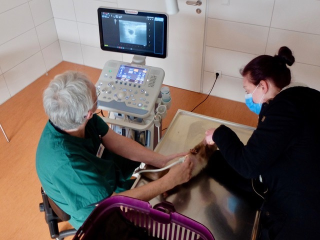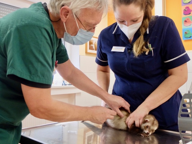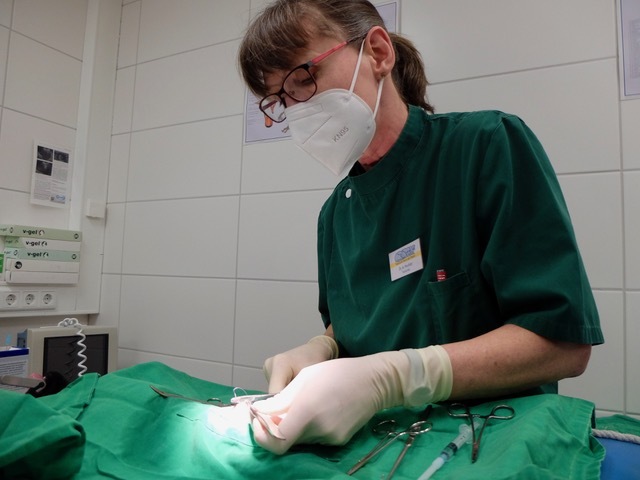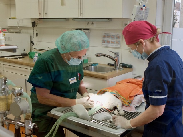 Pausen im Tagesablauf gibt es nur wenige, denn der Tag ist sehr gut durchstrukturiert. "Wir sehen durchschnittlich zwischen 40-60 Patienten am Tag", so Scholz. Er geht davon aus, dass er in Nordrhein-Westfalen die meisten Frettchen behandelt, deren Besitzer bis zu 250 Kilometer Anfahrt auf sich nehmen. Gefühlt sind gut die Hälfte der Patienten Hunde, stattliche 40 Prozent Katzen, der Rest setzt sich aus Heimtieren und eben Frettchen zusammen. "Wir müssen mal das Team von VETERA fragen, ob das auch wirklich stimmt", erklärt Scholz, der parallel ein männliches Frettchen untersucht, dessen Hoden im Leistenkanal stecken geblieben ist. Während der Praxischef die Frettchenszene noch näher eingeht, wird er von seiner Frau liebevoll und bestimmt ermahnt, da bereits der nächste Patient wartet und dieser Behandlungsraum gelüftet und desinfiziert werden muss.