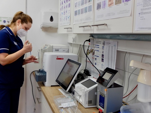 Seit gut fünf Jahren arbeitet das Tierärztepaar Heckler-Scholz mit sieben weiblichen und einem männlichen TFA am jetzigen Standort der Praxis. Die Arbeitsabläufe funktionieren in Tierarztpraxis, die seit Jahren schon als reine Terminpraxis angelegt ist, wie ein Schweizer Uhrwerk. Und das täglich von 8:30 bis 19:00 Uhr. Auf 230 Quadratmeter gibt es neben einem großzügigen Empfangsraum, ein Hunde- und ein Katzenwartezimmer, drei Behandlungsräume, einen Röntgenraum, Labor, Apotheke, OP-Vorbereitung, je eine Hunde- und Katzenstation, sowie ein Raum, der zur Euthanasie- und Abschiedsraum dient.