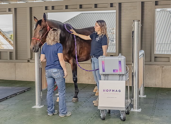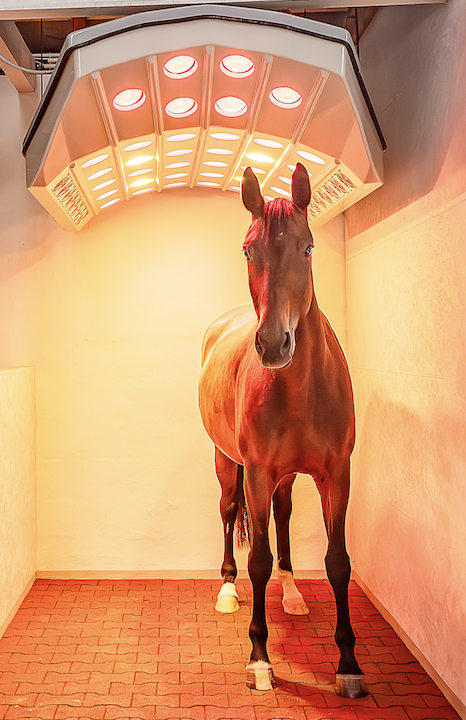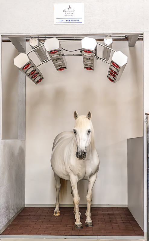 Um die Leistungssteigerung der Pferde zu erwirken, steht das Hofmag-Therapiegerät zur Verfügung, das mit kurzen und hochintensiven, gepulsten Magnetwellen das Gewebe der Patienten durchdringt und auf zellulärer Ebene die natürlichen Selbstheilungsmechanismen des Pferdes stimuliert. "Durch die Therapie beugen wir Verletzungen vor, aktivieren das Immunsystem und steigern so die Leistungsfähigkeit unserer tierischen Gäste", fasst die Ranchbesitzerin zusammen. Das Rehazentrum für Pferde verfügt außerdem über eine Solekammer, um die Atemwege der Tiere zu reinigen, die Lungen und das Immunsystem zu stärken, den Stoffwechsel anzuregen und die Heilung von Hautproblemen, wie zum Beispiel dem Sommerekzem, zu unterstützen. Darüber hinaus besteht die Möglichkeit, eine Moxalampe bei Schmerzpatienten einzusetzen und außerdem eine Farblichttherapie, um positive energetische Wirkungen sowie die Selbstheilungskräfte beim Pferd auszulösen.