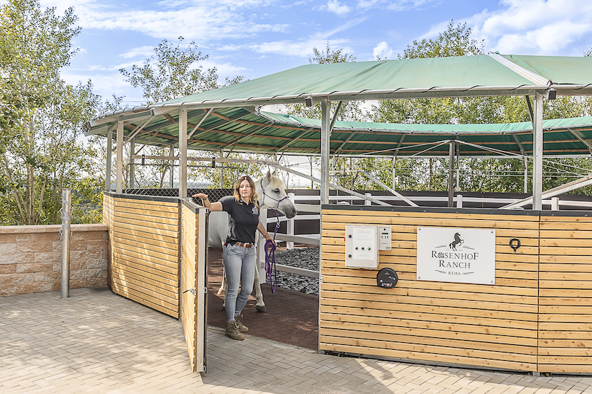 Am 29.06.2024 wurde dann offiziell die Rosenhof-Ranch mit einem „Tag der offenen Tür“ eröffnet und vorgestellt. Das Interesse war riesig, neben dem Bürgermeister informierten sich über 1000 Besucher:innen an diesem Tag über die Angebote des Rehazentrums. Das Interesse wächst von Tag zu Tag, vor allem, weil Sandra Schlatter und Peggy Parage auf den Pferdeveranstaltungen in der Umgebung Werbung für die Reha-Ranch machen. Zusätzlich wurden die Tierärzt:innen der Umgebung über die Möglichkeit informiert, ihre Pferdepatienten zur Rehabilitation nach Schönberg zu überweisen. "Wir bieten zusätzlich auch den Service an, Pferde im Umkreis von 50 Kilometern mit unserem Pferdetransporter abzuholen, um die Besitzer:innen zu unterstützen", verraten die Schlatters.