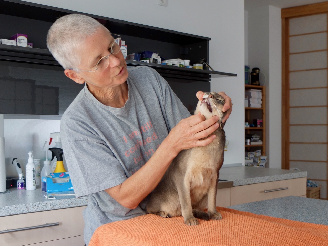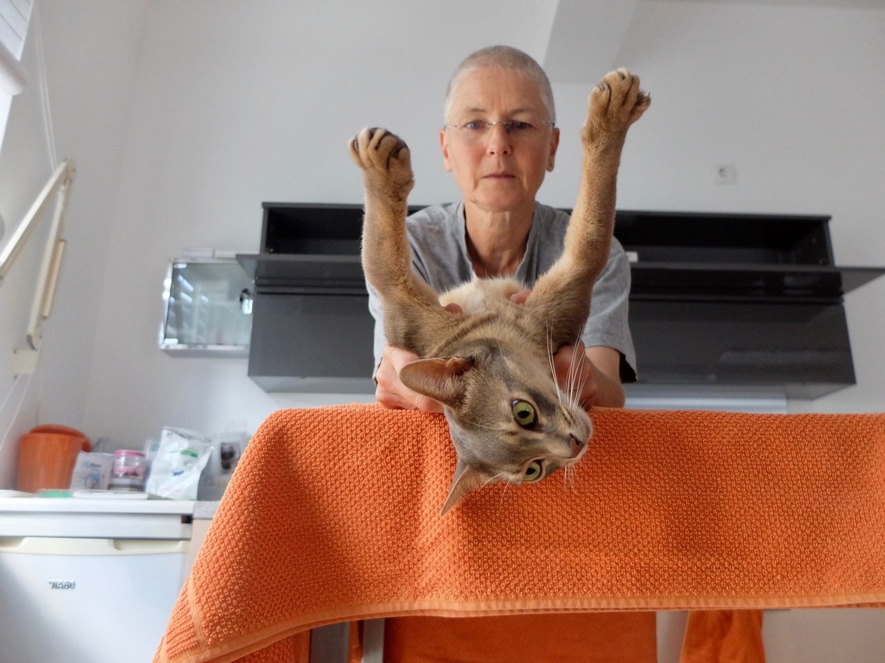 Damit die Katzen auf dem Behandlungstisch sitzen bleiben und sich untersuchen lassen, „baut“ sie einen Deckenkringel. „Katzen lieben Begrenzungen, fühlen sich sicher und lassen den Tierarzt dann auch an sich heran“, erklärt Schroll, „und außerdem gibt er mir Sicherheit, falls der Patient tatsächlich einmal beißen sollte.“ Wunder wirkt übrigens ein Buchenholzstäbchen geschmierte Leberpastete, die Patient „Sunny“ hingebungsvoll ableckt. „Ich mag sehr viele meiner Katzen, die ich teilweise 15 – 20 Jahre lang betreue“, so Schroll, „das macht mehr Spaß als nur Laufkundschaft zu sehen, was ja bei vielen Kliniken der Fall ist.“