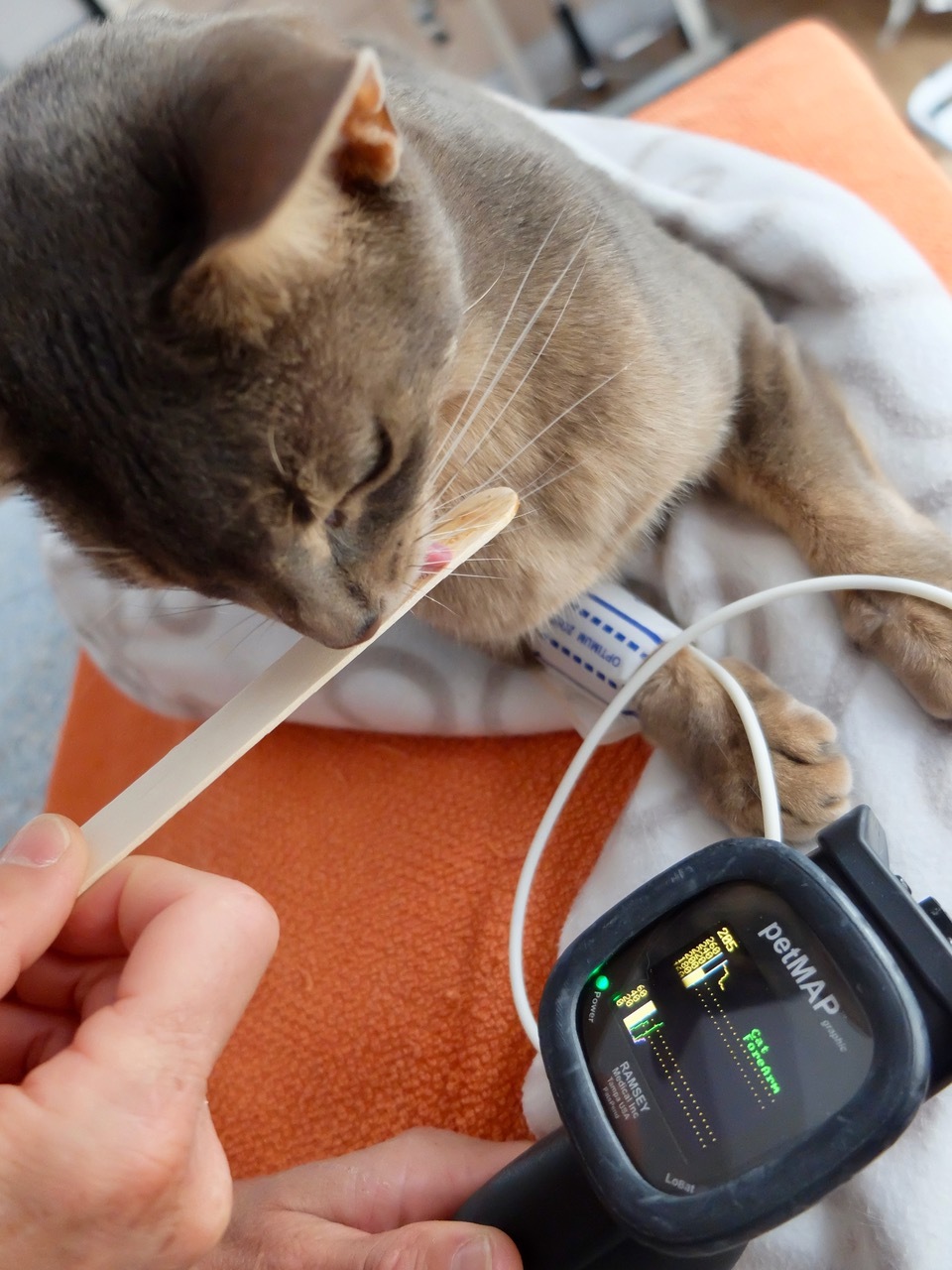 Wunder bei der Untersuchung wirkt übrigens ein Buchenholzstäbchen gestrichene Leberpastete, die Patient „Sunny“ hingebungsvoll ableckt."