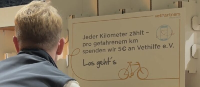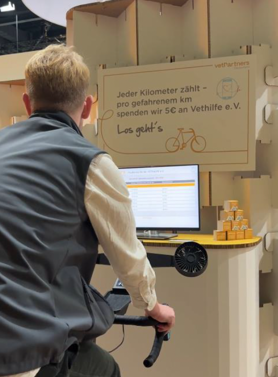 Mit einem starken Zeichen für Zusammenhalt und Fürsorge präsentierte sich das Tierärztenetzwerk VetPartners Deutschland am 6. und 7.11.2025 auf der VET-Messe im Rahmen des DVG-Vet-Congress in Berlin. Herzstück des Messeauftritts war ein Spendenfahrrad, auf dem Besucher:innen für den guten Zweck in die Pedale treten konnten: Für jeden gefahrenen Kilometer spendete VetPartners 5 Euro an VETHiLFE e.V.
