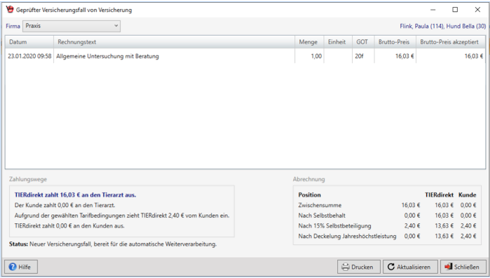 Auf Basis des transparenten Produktaufbaus ist es TIERdirekt gelungen, für Tierärzte eine schnelle digitale Abwicklung von Leistungserstattungen zu entwickeln. Die Übernahme Ihrer Patientenleistungen können Sie sofort in Echtzeit direkt in Ihrem Praxismanagementsystem überprüfen lassen und die komplette Abrechnung mit TIERdirekt auslösen.