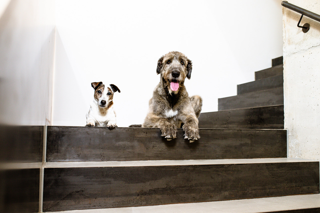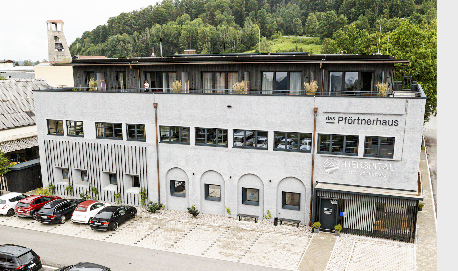 Persönlichkeiten wie Doppelolympiasieger und Skiweltmeister Markus Wasmeier, der hier ein Freilichtmuseum mit eine traditionelle Bierschöpf-Brauerei betreibt, Kapitänin Jasmin Lauber, die auf ihrem Motorschiff „Schliersee“ bereits tausende von Urlauber:innen über den See gefahren hat und Regisseur Marcus "Hausham" Rosenmüller, dessen Heimatfilm "Wer früher stirbt ist länger tot" in der Region spielt und 2006 fast zwei Mio. Zuschauer:innen in die Kinos lockte, stehen für die Alpenregion und machen diese weltweit bekannt. "In den Ferienzeiten ist hier deutlich mehr Betrieb, und da betreuen wir natürlich die erkrankten Tiere der Urlauber:innen", erklärt Dr. Jannis Uhrig beim Rundgang durch das Tierspital. Lange Zeit haben die beiden in der zehn Kilometer entfernten, am anderen Ende des Schliersees gelegenen Praxis gearbeitet. "Zuletzt sind wir aus allen Nähten geplatzt. Es gab keine Büros, keine Umkleiden, der Ultraschallraum wurde zusätzlich als Küche genutzt, und die Hälfte der Praxisfläche lag im Keller", beschreibt Uhrig, der betont, dass das für ein modernes Unternehmen keine haltbaren Zustände mehr gewesen wären. Da kam das Angebot, das ehemalige Pförtnerhaus eines 100 Jahre alten Bergwerkes in Hausham zu nutzen, um dann auf 700 Quadratmetern ein modernes Gesundheitszentrum für Kleintiere zu schaffen, sehr gelegen. Doch Bauanträge, Nutzungsänderungen, Teilabbruch, Sanierung und Umbauarbeiten verschlagen viel Geduld, Nerven und sehr viel Zeit - der ganze Prozess von der Umzugsidee bis zum Einzug dauerte letztlich über vier Jahre. Mit dem Ergebnis jedoch sind alle sehr zufrieden. Im Erdgeschoss des Pförtnerhauses ist die Tierklinik eingezogen, im Obergeschoss gibt es neben Büroräumen für die Tierärzt:innen und die Praxismanagerin noch ein Coworking-Space, das von den Tiermedizinier:innen u.a. für Fortbildungsveranstaltungen genutzt wird, und im obersten Geschoss steht der Praxiscrew eine große Dachterrasse mit Alpenblick für gesellige Momente zur Verfügung.