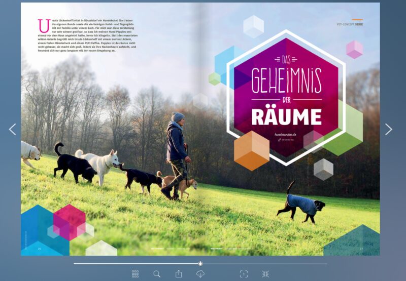 Gleich auf sechs Seiten wird die Hunderunde mit der Expertin für Mehrhundehaltung, Ursula Löckenhoff aus Düsseldorf beschrieben. Mit welcher Ruhe und Klarheit die Dogwalkerin mit sage und schreibe elf (in Worten: ELF) Hunden im Düsseldorfer Stadtteil Gerresheim unterwegs ist, kann man in gedruckter Form aber auch als E-Paper lesen.