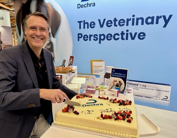 Dechra entwickelt, stellt her und vertreibt weltweit hochwertige Tierarzt-exklusive Produkte. Das Unternehmen ist für Tierärzt:innen aber nicht nur ein Arzneimittelhersteller, sondern auch ein wertvoller Partner im Praxisalltag. Thomas Weers, Countrymanager für Österreich, Deutschland und die Schweiz, weiß, dass sich alle, die intensiv lernen, auch eine süße Pause gönnen dürfen. Er schnitt in Salzburg eine übergroße, himmlisch leckere Sachertorte an und eröffnete den Standbesucher:innen eine besonders süße Perspetive. Mehr Infos: www.dechra.at / www.dechra.de / www.dechra.ch